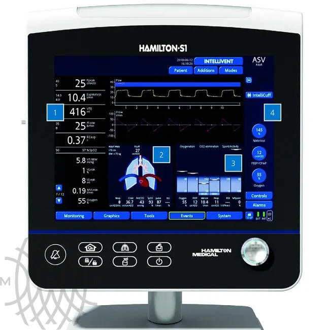 Помимо этого, в аппарате ИВЛ HAMILTON-S1 предусмотрены стандартный интерфейс пользователя Ventilation Cockpit, разработанный компанией Hamilton Medical, и уникальный режим интеллектуальной адаптивной поддерживающей вентиляции ASV.